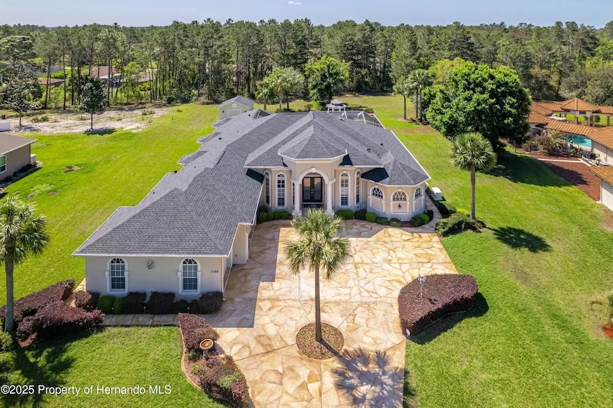 TOUCH OF CLASS...This Custom 1 Acre Estate with a Designer Pool in Woodland Waters Subdivision is Just STUNNING. Love the Private Backyard that offers trees for Natural Privacy, a 280 sf ''She Shed'' or Workshop and Pretty Steps to the Gazebo. The Back is set up for Entertaining Family & Friends with a Spacious Screened (New Screening in 2021) Lanai which is Partially Covered & a Gorgeous Solar (installed in 2021) HEATED POOL with Ornamental Spouts. A Designer's Touch with Arches, Double Doors & Transom Windows as you Enter through the Front Entry to a High Coffered Ceiling Foyer with Chandelier Plus Immediate View of the Pool & Gazebo as you Step into your home. To the Right is the Office with Bay Windows & Plant Shelves. To the Left is the Spacious Formal Dining Room which also has Bay Windows. Step further into the Formal Living Room which is the Room with the View & a Cozy Fire...