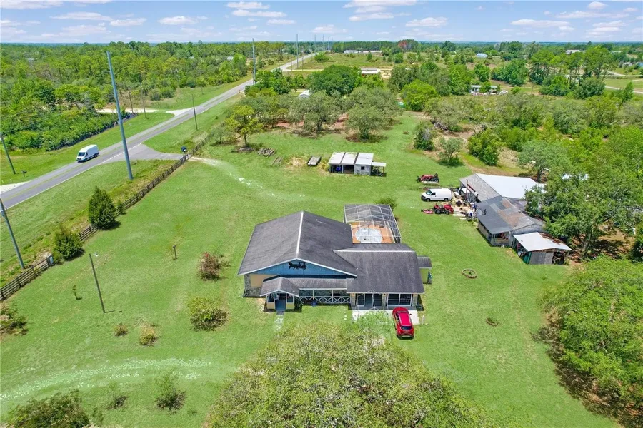 Opportunity meets potential on this slice of Florida countryside. 4.9 fully fenced acres at the corner of Hexam Rd and Sunshine Grove, this property offers the perfect blend of residential comfort, business potential, and recreational space. Zoned Agricultural, this property opens the door to a variety of farming or business ventures. Homesteading to horse boarding or nursery operations. It's prime location and frontage is currently zoned AG (Agricultural) and has a Future Land Use (FLU) designation of Rural, in accordance with the Hernando County Comprehensive Plan. Per the Comprehensive Plan, the Rural FLU designation allows for certain Neighborhood Commercial and Agricultural Commercial uses. AADT (Annual Average Daily Traffic) 14,500. Public water and sewer are available nearby. The home was custom-built by the owner, with 2 bedrooms, 2.5 bathrooms and was built to commercial code standards with electric wiring ran through steel conduit, 15-inch soundproof exterior walls, 12-foot high vaulted ceilings, and handcrafted Amish hickory cabinets. The open floor plan is perfect for entertaining, with a giant kitchen featuring an island for eating. Outside the cool epoxy deck has a deep private pool with an outdoor kitchen, a large screened-in lanai, and oversized ceiling fans, perfect for hosting family or clients. The property includes a horse barn, outdoor sinks, and fully fenced pasture with multiple gated entrances for easy access. The main workshop is fully powered and features a half bath, air lines, and plenty of shelving, ideal for running your business. Perfect set up for car enthusiasts, electricians, woodworking, powder coating, or storage. An additional building functions as an office, extra storage, or flex space. This is a rare opportunity for entrepreneurs or hobbyists to run their operations from home. The property has a second septic tank for RV hookup. Currently zoned AG this property is one of the last in the area that allows for a mini-farm, with the potential for future commercial zoning. Setback Grandfathered at only 75 ft from road center. Approved uses may include farm implement sales, agricultural supply, feed store, or even a place of worship. With Sandal Key being developed nearby, this is a rare opportunity to own 4.9 acres with no HOA, unmatched space, and future potential in a rapidly growing area. Located just minutes from Weeki Wachee Springs, US-19, SR-50, and the Veterans Expressway, you're close to Publix, restaurants, gyms, and beaches while still enjoying a peaceful rural setting. Everything you need is minutes away!! So much potential for this property! Call today for more details.