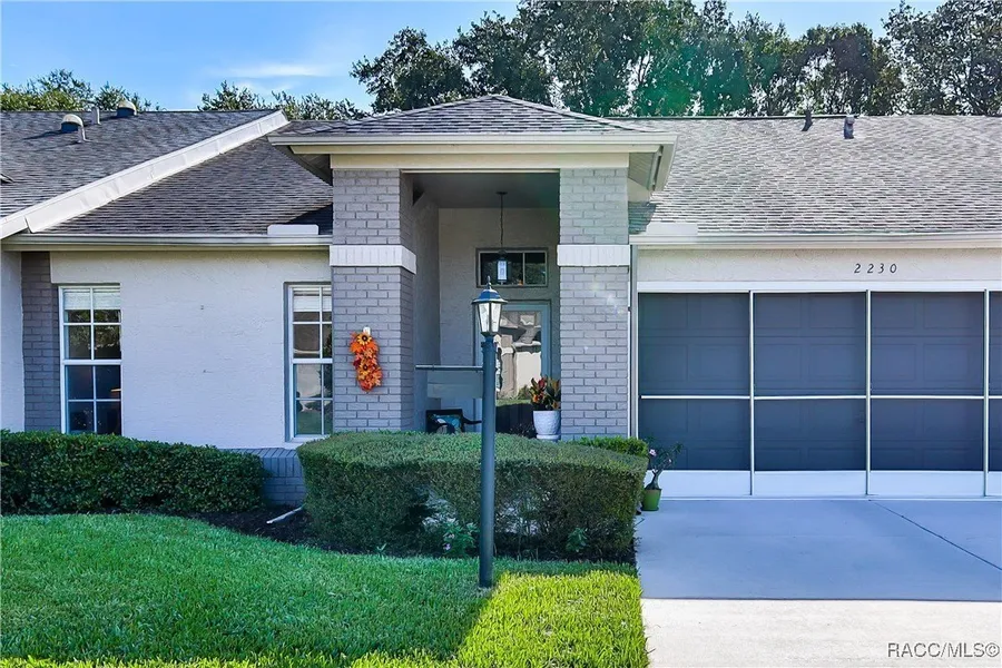 FULL CLEAN INSPECTION REPORT AVAILABLE TO BUYERS- Welcome to this charming 2-bedroom, 2-bathroom attached villa with a 2-car garage, offering both comfort and convenience. Step inside to a spacious living and dining room with vaulted ceilings, creating an open and airy feel. The kitchen is bright and inviting, featuring white cabinets with pull-outs, an updated backsplash, newer refrigerator and range, a pantry with pull-out shelving, and attractive wood-look flooring. The adjoining dining area overlooks a peaceful park-like setting with mature trees and provides access through sliding glass doors to a screened-in patio-perfect for morning coffee or evening relaxation. A well-equipped laundry room with sink and cabinets sits just off the kitchen for added functionality. The primary suite is light-filled and spacious, boasting two walk-in closets and a private en suite bath with dual sink vanity and a walk-in shower. A second bedroom and full bathroom provide comfort for family or guests. From the living room, sliding glass doors lead to the lanai with a beautiful paver patio, where you can enjoy tranquil views and Florida's indoor-outdoor lifestyle. This villa combines low-maintenance living with style, includes irrigation, lawn mowing, front hedge trimming, lawn fertilization, weed control, exterior painting, termite protection. This is a dog-free village. Timber Pines is a highly sought-after, guard-gated, 55+, deed-restricted community offering a resort-style lifestyle: three 18-hole golf courses, a 9-hole pitch & putt, tennis, 12 pickleball courts, two community swimming pools, country club restaurant and bar, fitness center, billiards, performing arts, and over 100 social clubs and activities.