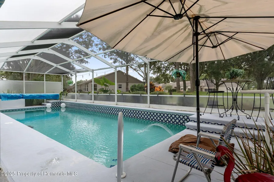 Welcome to this totally updated FURNISHED POOL HOME. SOLAR HEATED POOL WITH NEWER PUMP. The open floor plan is so inviting to entertain guests and family. Upon entering the home through the etched lead glass front door you will notice the unique architectural flare of the arched entrance to the family room and the crowned moldings. This home has character and shows pride of ownership. Once inside the family room the custom built bar will be sure to catch your eye. The updated kitchen offers tons of cabinets and granite counter space with a new microwave. New matching flooring throughout except for the kitchen and bathrooms. Beautiful newer hurricane impact windows and sliders modernize the home. Welcome out back to your large pool deck , large enough for many pool parties in your oversize 12X34 pool that is 6.5 ft deep. In addition the newer hot tub will convey with the home. The pool cage has been recently rescreened and the home includes storm curtains protecting the lanai area. The home offers an inside laundry room and a 2 car garage with a club car golf cart included in the sale. Attic fans installed and gutter guards were recently installed. In addition the primary bathroom has a walk-in shower , no step down. You will find this home perfect for your Florida lifestyle. In addition, the home is located in the resort community of Timber Pines. Come and enjoy 4 golf courses, 2 pro-shops, tennis, newer pickleball courts, 2 community pools, a driving range and 2 putting greens. A full time restaurant, with a performing arts center and a new multimillion dollar fitness center. The community has so much to offer with numerous activities and entertainment that you will never be bored. Call today for a showing. THIS HOME COMES FURNISHED WITH A GOLF CART.