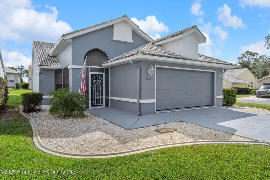 Welcome to the serene GlenLakes golf lifestyle! This move-in ready 2-bedroom, 2-bath villa is maintenance-free and turnkey. It features a light and bright open floor plan with vaulted ceilings and updated flooring throughout. The split plan affords privacy for guests, with their own bedroom and bathroom. As you arrive, you'll be greeted by fresh landscaping, complete with curbing to keep it looking great. The covered front patio is screened, providing the perfect spot for your morning coffee. Upon entering the home, you'll find the guest bedroom and bathroom up front, as well as a spacious coat closet. The hallway leads you into the heart of the home-a spacious open family room with an adjoining dining area. From here, you can head into the large kitchen with plenty of cabinets and the laundry area, as well as access to the garage. At the back of the home, you'll find the primary bedroom suite, complete with double walk-in closets and a luxurious bathroom featuring a walk-in shower and jetted tub. Both the primary bedroom and living room have sliding doors that open to the large screened lanai. The villa is just a street away from the private community pool. With this home, all you need is your suitcase to start living and experiencing the Florida lifestyle! Located in the gated, prestigious GlenLakes community, residents enjoy a host of optional amenities including a clubhouse with restaurant and bar, 18-hole championship golf course, pro shop, Jr. Olympic-size pool, tennis, pickleball and bocce courts, fitness center, and countless social clubs. Social and golf memberships are available but not mandatory for this home. The GlenLakes community is situated along Florida's Nature Coast, offering convenient access to beaches, shopping, dining, medical facilities, and the Suncoast Parkway. HOA dues include 24/7 manned security, cable TV and internet (via Spectrum), lawn maintenance, and irrigation. Enjoy low-maintenance living in Hernando County's premier golf course community!