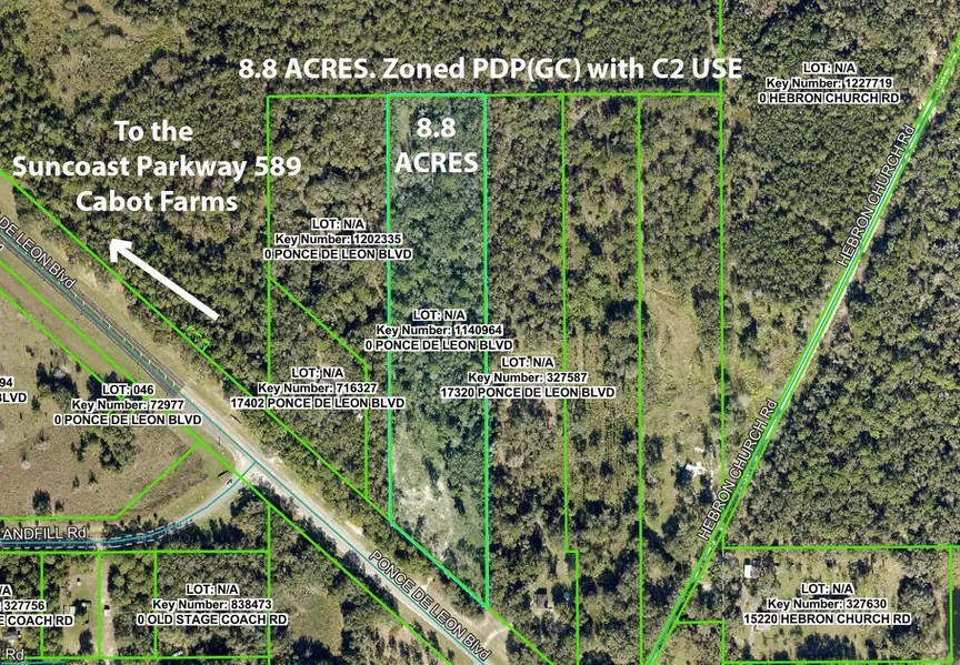Commercial Land!! 8.8 ACRES ZONED PDP(GC) with C2 USE!! Located directly on Ponce de Leon (US 98) just east of 589 (Suncoast Parkway) and Cabot Farms!! GREAT ZONING!!! GROWING AREA!!