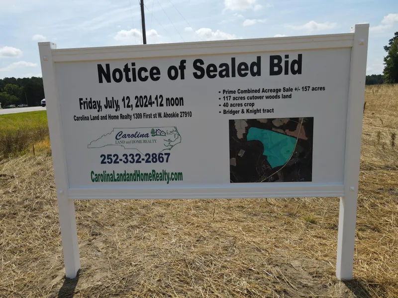 1. Only sealed bid, cash lump sum written offers will be accepted. Bids may be mailed prior to the sale or delivered to the office of Carolina Land and Home Realty, LLC located at 1309 West First St. Ahoskie, NC 27910. All bids will be opened on Friday, July 12, 2024 at 12:00PM. The seller reserves the right to reject any and all bids and award the bid in the manner deemed in their best interest.