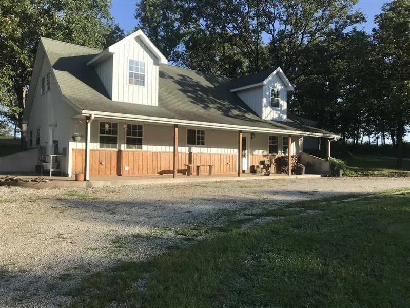This four Bedroom, 2 and 1/2 bath, Metal sided Cape Cod, with 2 car detached garage, deck, and above ground pool is located in Skyline school district and just few miles from Lake Pomme De Terre Hermitage boat launch. House is all electric with a wood burning stove for back up heat. You can sit on the covered front porch and watch the fish jump in the stocked pond, or sit around the camp fire across pond in the evening and roast marsh mellows. Property includes 8 acres, a chicken coop and dog kennel (both on concrete) and a 30/40 barn with 2 horse stalls and a tack room and another room used for a chicken coop or 3rd stall. The barn has a lean-to and is surrounded by a pipe corral and two sorting pens with easy load out. Next to the barn is fenced established mixed grass pasture with a few scattered trees for shade - good for a couple horses or calves. Property also includes about a...