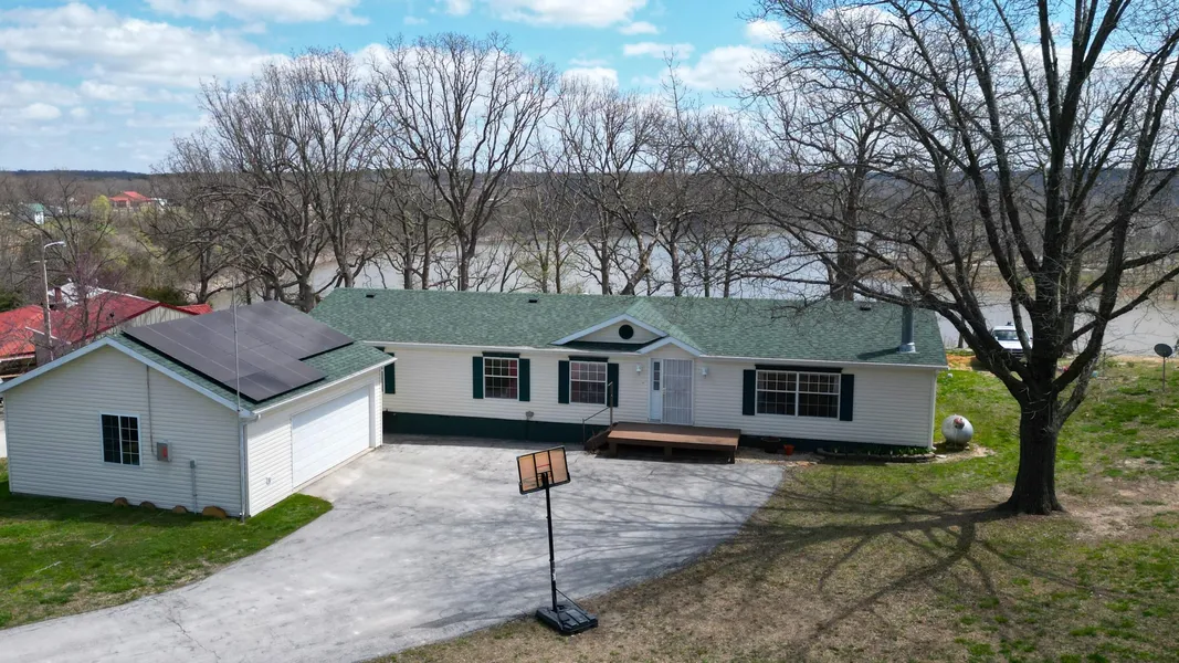 Ready to enjoy fantastic views of the lake? Look at this wonderful home (3 Bd, 2Ba, 1716 sq ft) with open floor plan: a great use of space and plenty of natural light. Enjoy the Pomme de Terre lake views for the backyard patio where you can soak up the sun and the fire-pit area is ideal for gathering to enjoy the views on cool nights. On the roof of a detached 2-car garage sits new solar panels that provides savings in electricity for the home. Also, a new Generac generator is currently being installed. A manufactured home that is set up right; it's on a full concrete pad and fixed to the property. Whether you're looking for a weekend getaway or a year-round residence, this beautiful lakefront home is sure to impress. Don't miss out on the opportunity to make this home yours.