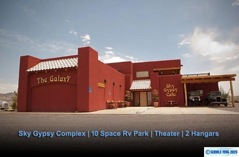 In 2004, the pioneer of the McAfee anti virus software, John McAfee, moved to Rodeo and spent upwards of $11 million developing an airpark for “kite-planes”. Now being offered for sale. 2 Morton Hangars 55'x51' with 50'x12.5' clear opening Schweiss bi-fold doors and remote operators, equipped with full shower/bath facilities, HVAC, phone hookups and RV hookups. The former Sky Gypsy Cafe is nearly 3000 sq/ft high grade commercial construction with attached 35 seat Galaxy Theater. Fine finished cement floors and hand planed hardwoods upstairs. Extensive subsurface irrigation for landscaping. · State of the art climate controlled Greenhouse with automated water sensors. · RV Hookups for 10 with water, electricity and sewer and adjoining patios. · 2 separate 15'X27' men's and women's heated restrooms and Shower Facilities. · Amigos Del Cielo Airport NM90 is 6000' Landing Strip · 4 bedroom, two bath Manufactured Home, centrally located within the complex. Astronomy and bird watching!