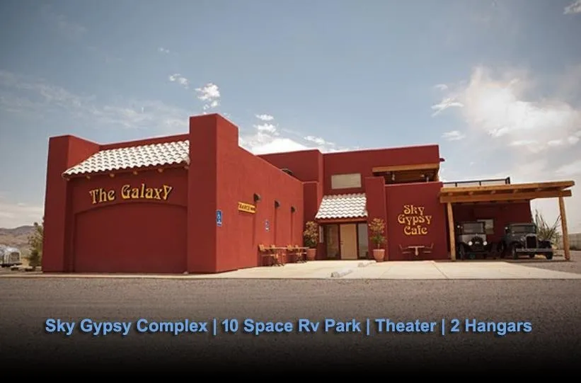 In 2004, the pioneer of the McAfee anti virus software, John McAfee, moved to Rodeo and spent upwards of $11 million developing an airpark for “kite-planes”. Now being offered for sale. 2 Morton Hangars 55'x51' with 50'x12.5' clear opening Schweiss bi-fold doors and remote operators, equipped with full shower/bath facilities, HVAC, phone hookups and RV hookups. The former Sky Gypsy Cafe is nearly 3000 sq/ft high grade commercial construction with attached 35 seat Galaxy Theater. Fine finished cement floors and hand planed hardwoods upstairs. Extensive subsurface irrigation for landscaping. · State of the art climate controlled Greenhouse with automated water sensors. · RV Hookups for 10 with water, electricity and sewer and adjoining patios. · 2 separate 15'X27' men's and women's heated restrooms and Shower Facilities. · Amigos Del Cielo Airport NM90 is 6000' Landing Strip · 4 bedroom, two bath Manufactured Home, centrally located within the complex. Astronomy and bird watching!