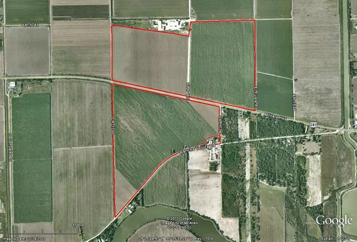 BEAUTIFUL SOUTH TEXAS FARMLAND. This farm includes 234+/- acres - approximately 131+/- on the north side of Military Highway (US 281) and 102+/- acres on the south side. Land can all be irrigated. Highway frontage has good development potential. Row crop and sugarcane farmland. Farm headquarters is included in sale.