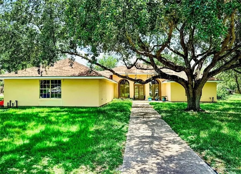 Spacious home feels like out in the country for viewing of stars at night! Sits on 1.23 acres w/East wing having 2 bedrooms/1 bath; West wing w/split bedroom; master suite w/jacuzzi for relaxation w/his/hers double vanity/mirrors. The north bedroom has beautiful view of Oaks-office/library. Over 2,500 sq. ft.: 4 bedrooms, 2 baths and 1/2 bath. Large living area has high ceilings-versatile for entertaining. Arches: front to back of living area. Propane gas stove in kitchen. Spacious yard with fruit trees and chicken coop. Huge gazebo—seating all around for gatherings. Large patio w/party lights. Beautiful bridge with walkway all around. Large oaks ready for outdoor swing/tree house. No HOA yet subdivision is well kept and spacious. Roomy storage shed w/ loft. Extra large Garage w/plenty of storage cabinets. Close to RGV / A&M campuses. Don’t miss out on this property! $5,000 seller's con. available with reasonable offer; to be sold "as is". Schedule your private tour today!