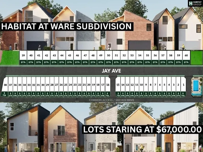 Welcome to Habitat at Ware a unique subdivision that offers 60 Lots with 9 different designs for buyers , builders and investors to select.