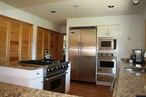 # 27.5' x 12.8' kitchen with built in pantry, appliance storage, granite surfaces, Viking professional appliances, double sink, microwave, two ovens,(one propane, one electric)and a warming draw, propane range top with 4 burner center grill
