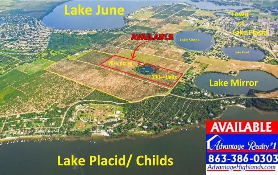 90+-acre Including Lost Lake! This potential lakefront community is Zoned R1A 3 lots per net acre for 270+-Units at only $10,000 per lot. This site is currently all in citrus grove production with a clean phase 1 report and a new survey making this your next ideal site to develop or 1031 exchange property to hold for even more potential upside! This beautiful property is located the Lake Placid, FL a coveted and fast growing get away for the congested east and west coasts. Only a short 1-1.5 hours away.