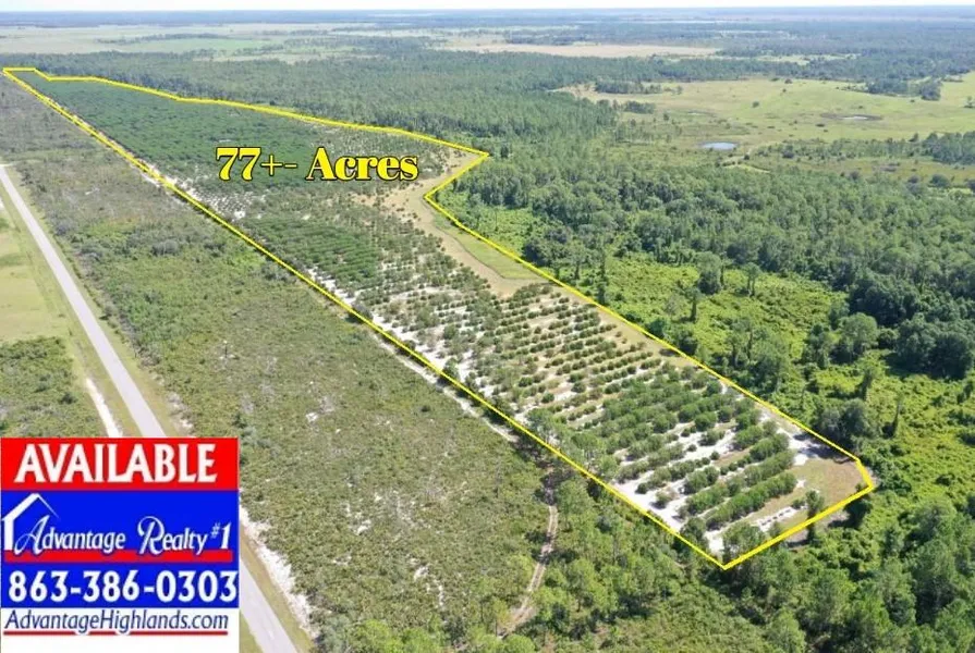 77.93+-acre Good Producing Citrus Grove Nestled in between State Conservation Lands to West & Large Ranches to East makes this Prime Wildlife area. Citrus grove produces 256 boxes per acre of early/mids with a large 12"well that waters entire grove at one time protecting it from freeze. Great soils allow adequate drainage yet hold moisture where needed. This citrus grove is magnet for all the surrounding wildlife to come to as it is the only food source of it's kind in the area for miles! Come enjoy the income of this one of a kind property while securing one of the finest hunting areas in Highlands Co. Or come build your dream home where you will have the ultimate privacy & any type of food you wish to grow!