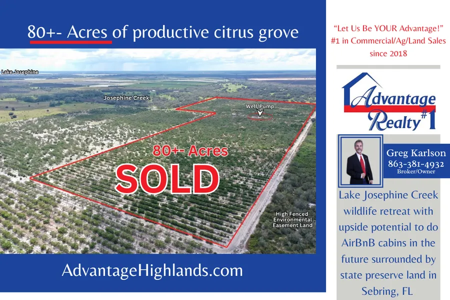 80+- Acres of productive citrus grove located next to a wildlife preserve along Lake Josephine Creek & Lake Istokpoka Wildlife preserve corridor. As a result bountiful number Deer, Turkeys, and wild hogs can be hunted on this property. Acres of citrus grove located next to a wildlife preserve. Come plant game plots, bring your RV/ Cabin(s) to either create the perfect air B&B private retreats or simply use for your own enjoyment. Upside Potential: Anytime you want some extra profit potential after developing this perfect retreat simply exercise this upside potential by applying for the Florida Forever program that pays you to preserve this beautiful habitat while using for your enjoyment.