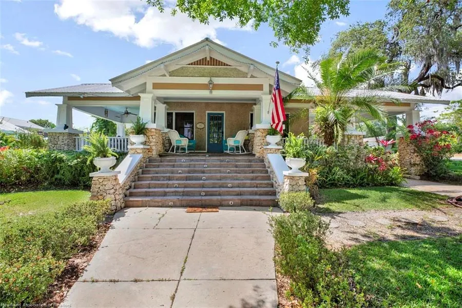Room for you & your guests in this 1926 pool home situated on an oversized corner lot w/metal roof, carport, huge rocking-chair front porch + pool-side cabana guest cottage w/2nd story 1-bedroom efficiency apt. Main house includes 2 BD, 2 BA, formal living/dining room, breakfast room, fireplace, wood/tile floors, kitchen & baths updated; kitchen w/quartz & white cabinetry, master w/claw tub, antique dresser sink & walk-in closet. Caged pool w/adjacent cabana guest quarters complete w/full bath, living area & closet. 2nd story apt. w/BD, BA & kitchen. Exterior w/well irrigation, variety of fruit trees & unique coquina shell exterior. House has added blown-in insulation; is hard-wired for generator, has security system & central water/sewer. Furniture package may be negotiated separately. VIRTUAL TOUR