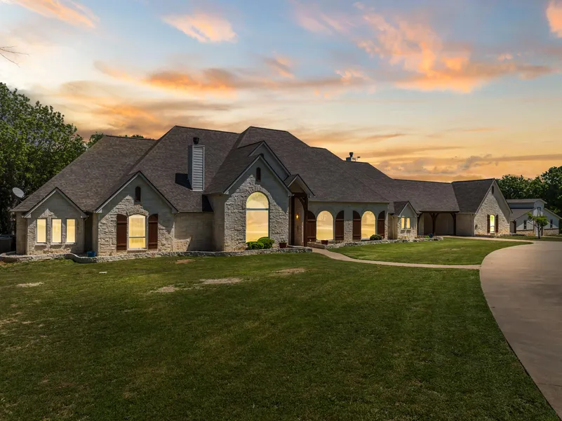 Discover sophistication within this amenity-rich sprawling 28+ acre estate! Thoughtfully designed to embrace its lush surroundings, the tucked away estate features expansive sightlines that capture the beauty of nature and wildlife surrounding Richland Creek. A seamless blend of grandeur and functionality, the residence offers spacious formals, multiple living and dining areas, and an array of rejuvenating indoor and outdoor spaces. The primary suite is a true retreat, boasting an en-suite bath with free standing jetted tub, dual shower heads with body jets spraying from the wall to completely surround you with water, and a 21x10 walk in closet with custom closet system. Featuring 4 in-house bedrooms, each equipped with walk in closets and ensuite bathrooms for optimal privacy. A stone fireplace anchors the open-plan family room off the kitchen. Two car attached garage and two car detached garage are connected by a drive through carport with direct access to utility room. Maintained superbly with many custom touches such as UV block on windows in main areas to stop temperature and UV rays with a one way tint effect allowing nature to be observed without nature spotting you! Wildlife observed on the property include deer, bobcats, turkey, and 2 great horned owls. 2100 sqft climate controlled 2 story barn style detached building has roll up garage door, half bath, and covered side porches could serve as additional living for guests with minimal modifications. Paved FM road with gated secured entrance and smooth concrete driveway, there is a second property entrance off 934 with a double gate. Easy access to both 35E and 35W and centrally located between DFW & Waco. Your serene haven on premium land is beckoning you!
