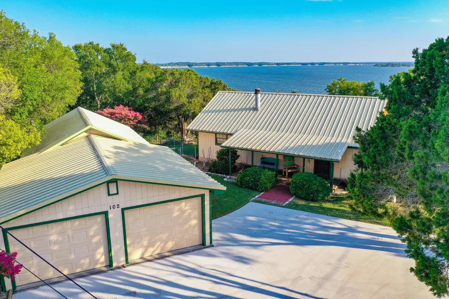 Lakefront house with direct access to Lake Whitney, great opportunity for short-term rental investment property or waterfront residence. Cedar Creek area, overlooks Pioneer Cove, convenient to Cedar Creek Park and Lake Whitney Marina. 2BR 2BA 1800 sqft home includes 2 spacious living areas with numerous windows and an open kitchen and dining area, perfect for entertaining family and friends. Nice outdoor living space including large deck and sauna, fenced side yard with surrounding trees. Wooded lot includes good hardwoods sloping down toward the lake with trail leading down to the waters edge. Detached garage is extended length to accommodate boat parking, workshop space at rear of garage. In-ground storm shelter onsite.