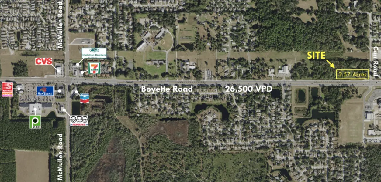 LOCATION DESCRIPTION The property is located at 10021 Carr Rd in Riverview, FL. It sits on the north-west corner of Boyette Rd. and Carr Rd. with over 630 feet of frontage on Boyette with a depth of 180 feet on Carr Rd with a full access median break on Boyette Rd. The property is on the going to work side of the road, between I-75 and Fishhwak Ranch.