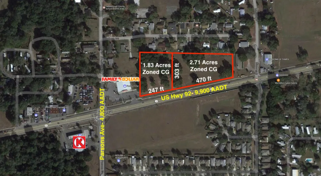 PROPERTY DESCRIPTION - The opportunity is to purchase either a 1.83 acre or 2.71 acre parcel located on the north side of E Hillsborough Ave (U.S. Highway 92) in Seffner, FL. Both parcels are zoned for general commercial uses with a total of over 710 feet of frontage on U.S. Highway 92. The seller would happily sell both parcels together for a discounted price.