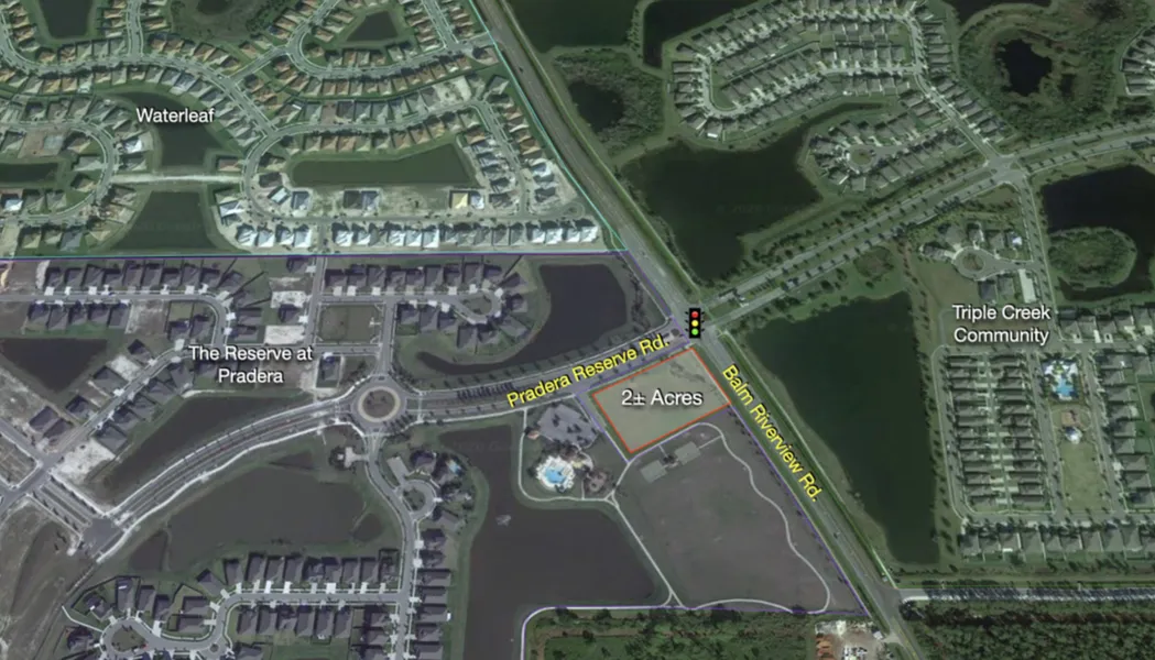 LOCATION DESCRIPTION - The property is located at the intersection of Balm Riverview Rd. and Pradera Reserve Blvd. in Riverview, FL. Situated at the entrance of The Reserve at Pradera a new upscale master-planned community by Beazer Homes/Tampa, giving the site prime visibility.