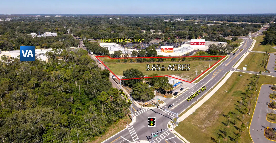 PROPERTY DESCRIPTION - The subject property consists of a vacant 3.85 gross acre commercial outparcel located at the northeast corner of Harney Road & Davis Road in Temple Terrace, Hillsborough County, FL. This vacant site is an outparcel to Point Plaza Shopping Center, a Winn Dixie Anchored Shopping Center. The site consists of 2.5 upland acres and 1.35 lowland/wetland acres. The propertys wetland area serves as a master retention pond for the subject site as well as for the aforementioned shopping center. Once developed the site will have the ability to be accessed via a full directional ingress/egress access drive along the west side of Harney Road. The site also has the ability to be accessed via a full directional ingress/egress along the east side of Davis Road.