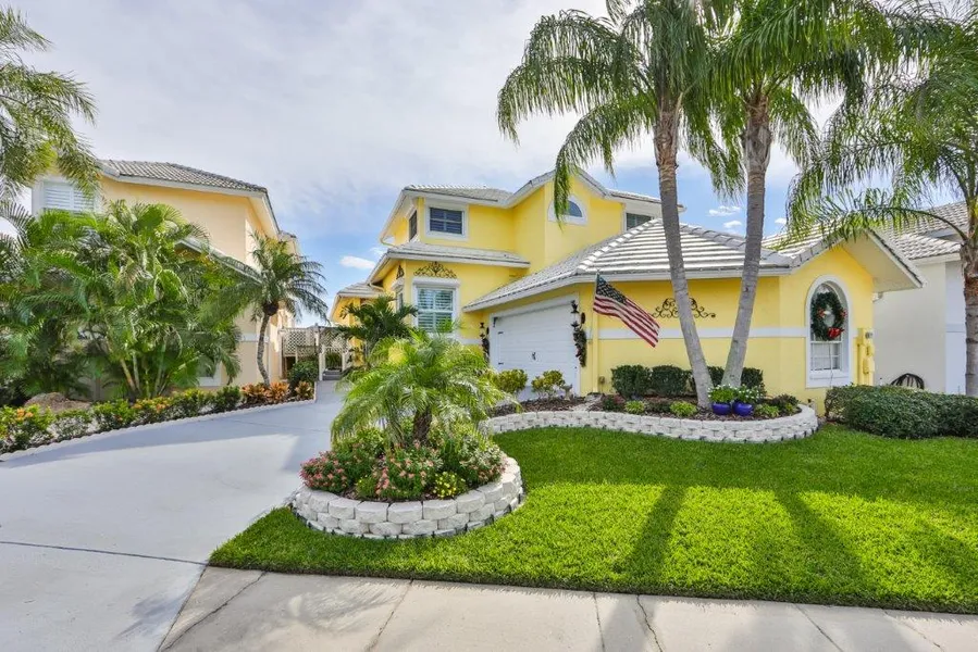 Welcome to Symphony Isles! 3 Bed, 2.5 bath, 2-car garage. This home has the most spectacular panoramic water views! Youll enjoy beautiful sunrises and sunsets while your boat is safely docked on your 13,000 lb. lift! Grand entryway into the family room has soaring cathedral ceilings, elegant crown molding throughout the home, plantation shutters, custom trim work, upgraded lighting and much more! This impressive home was meticulously painted inside and out in 2020, and the gleaming white roof was reglazed in 2019. The Master Suite is on the main level w/ panoramic water views, walk-in dual mirrored closets, fully upgraded master bath with shower, bathtub, and dual travertine sinks. Upstairs will greet you with two bedrooms, Jack and Jill bathroom, and a spacious loft with custom cabinetry. This home offers newer double pane windows with Rolladen hurricane shutters, new sod with tropical ...