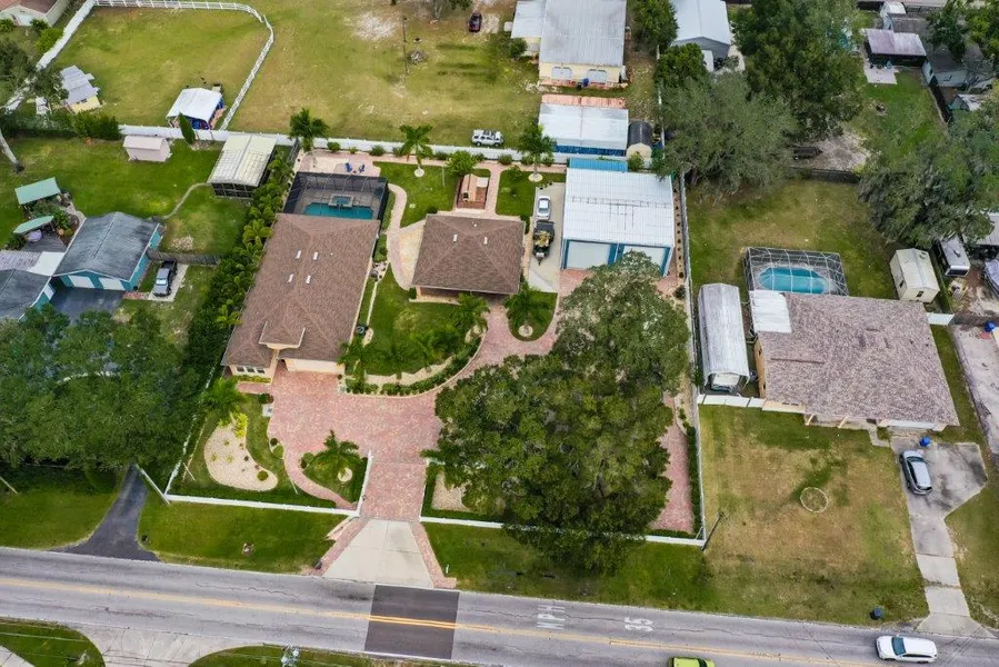 Back on Market due to Financing. This is truly a unique opportunity to have your own private compound on prime land in Riverview with No HOA/CDD. Nestled away are two homes and large 40 x 40 steel building that can used for storing all your toys including an RV. Both homes are upgraded and ready to move in. The main house features three bedrooms and two bathroom with a POOL, SPA, and screened in lanai. Outside of the screened area relax by the fire pit on those cooler Florida nights. Tiled throughout, all cabinets are white with soft close doors and counters are natural stone. The kitchen has stainless steel appliances with a double oven and a huge 15 foot kitchen island. This home was made for entertaining inside and out. The second home is two bedroom and two bathroom and can be a mother-in-law house, an office for your business, or even a rental for extra income. This home is also tiled throughout with an upgraded kitchen and bathrooms. The 40 x 40 steel building is a must see. Big enough for anything you need to store. Upstairs is air conditioned with an office, bathroom with shower, and some other extra secret rooms. The possibilities are endless at this property. Close to Hwy 301 nd I-75 for easy access. Plenty of shops and restaurants close by.