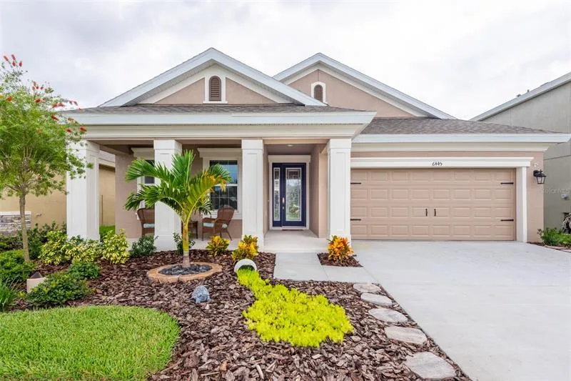 Wow! Stunning 6 month young, single story home in much sought after Waterset! Why wait for new construction when you can have what looks to be a model home. All upgrades and extras were chosen with a class eye! As you enter the home, notice the tight and beautiful landscaping just off the front porch. Come into, what truly feels like spa living. Enter through a sleek, leaded glass insert door into a welcoming foyer with 12' ceilings, which leads into a truly open concept kitchen, dining and family room. Throughout this beauty you notice other extras such as recessed lights, sheik ceiling fans and light fixtures, new blinds with cornices, 9' doors, and double paned windows (hurricane shutters in garage). The gorgeous, well appointed kitchen has stylish Pottery Barn Pendant lighting over the island that can seat up to 4. Counters in all baths and kitchen are an upgraded 1" quartz and a glass tiled backsplash really completes this kitchen. Stainless Samsung French door refrigerator, and GE GAS cooktop, dishwasher and microwave, stainless farm sink, walk-in pantry, pull out trash and recycle, and extra deep drawers for pots and pans, or dishes makes for a great kitchen to work in. Master bath has dual closets and vanities, separate toilet room, linen closet, and a large walk-in shower with tiled bench and window for light. Inside laundry room has a sink with an RO system and two brand new, rose gold Samsung washer and dryer. Check out the pristine garage with interlocking polypropylene tile flooring - pretty cool, and the tv and mount stay with you for your garage work days! Enjoy the large screened lanai with a seamless screen. There is front and back St. Augustine grass as well as an irrigation system in place for both. A highly efficient home with a smart thermostat and hurricane rated windows. There are three entrances into Waterset for your convenience. This resort style community has 2 pools, tennis, basketball, pickleball, volleyball,a fitness center, 12 miles of trails, 10 outdoor fitness stations, splash pad and dog park and a restaurant! So close to great shopping, beaches, Tampa International, downtown Tampa, St. Petersburg and Sarasota! Don't miss your opportunity to see a beautiful, brand new home to call your own - now!