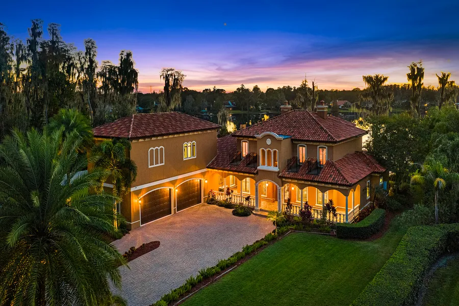Spectacular private lakefront estate with scenic views from nearly every room. This gated residence of 8.86 acres is situated on the expansive Lake Brant with a palm tree-lined driveway leading up to the front porch, highlighting the grand 22-foot-high entrance. An incredibly functional layout for an active family, the formal living room will greet everyone as the focal point of the first floor, giving access to the large family room, the entertaining parlor, formal dining room, executive office, owner's suite and a guest suite, while the sizable upstairs loft connects the secondary bedrooms, along with the study and three verandas that boast dramatic water views. The expansive layout blends the outdoor decks and terraces in harmony with the interior living spaces, providing a year-round lifestyle to enjoy the sunny weather and the lake breeze. From the moment you enter the home, the luxurious interior details and superior craftsmanship will draw you in with skilled millwork throughout, 14-inch crown molding, wood ceilings, wrought-iron accents, 8-foot interior doors, plantation shutters, remote shades, pass through wet bar, custom stonework and top-of-the-line fixtures. The well-appointed chef's kitchen features a butcher block island, 48-inch Wolf gas cooktop, side-by-side Sub-Zero refrigerator, pot filler and chic custom hood. The owner's retreat reveals a stunning master bath with an elegant freestanding tub and an oversized walk-in shower equipped with a substantial rain head, body sprays, natural stone tile walls and pebble floor. The impressive game room has floor-to-ceiling windows overlooking the backyard lakefront oasis, another sophisticated wet bar, a private bath with steam shower, and connects to the theater room with screen and projector system, inviting multitiered seating, accent lighting and professional-grade electronics. Outdoor amenities abound, leading off with the remarkable heated pool and spa on the wide travertine tile deck and a poolside fire pit connecting to the summer kitchen and outdoor fireplace. Additionally, a stylish sport/basketball court with covered observation deck, nine-hole putting green, sand volleyball court, freestanding playground and unique 200-square-foot boathouse with composite decking, covered boat lift, floating dock and boat ramp. Property also contains a generous four-car garage, additional storage room, home generator, camera security system and seawall. Located in the sought after Steinbrenner school district, as well as a short drive to Tampa International Airport, downtown Tampa, Avila Golf and Country Club, Raymond James Stadium, great attractions like Busch Gardens or Zoo Tampa at Lowry Park and endless dining and entertainment options the area has to offer.
