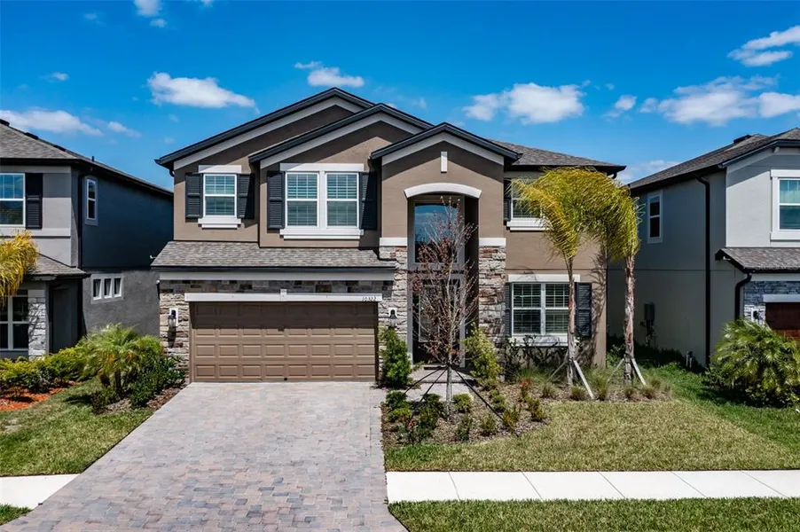 Welcome home to the highly desirable community of K-Bar Ranch! This beautiful Sonoma II built in 2021 by MI homes, is located in the gated Redwood Point subdivision. As you approach the home, you'll notice the upgraded stone elevation, and stone pavers matching the beauty you'll find inside the home with its exterior. Entering the foyer, the home shows like a model! You are greeted with volume ceilings, and natural light reflecting off glazed ceramic wood look floors. To the right of the foyer is a flex room that can be a formal dining room, or office. As you move down the hall, the laundry room with full size washer/dryer, and sink with storage is on your left. The Kitchen, breakfast area, and great room are open creating a great space to entertain family & friends. The gourmet Kitchen features granite counter tops, 42" cabinets with crown molding, stainless steel appliances, dual ovens, and an oversized island with a large and upgraded faucet. You will find the butler's pantry and the walk-in pantry tucked away in the hallway between the kitchen and dining room. Storage space in this home will not be an issue with the large storage space under the stairs, and numerous cabinets in the kitchen, and butler's pantry. Access the backyard through sliding glass doors from the great room, or the breakfast area onto your large, covered lanai overlooking the pond to enjoy your morning cup of coffee. Electric shades covering the sliding glass doors offer just the right amount of privacy. Behind the great room is a first-floor guest suite and shared full bathroom. Moving to the second level, at the top of the hardwood stairs, you enter the open loft area providing a welcoming space to host friends & family for game night. The oversized owner's suite located on the 2nd floor with amazing views of the pond from the large windows over the sitting area. The en-suite has granite counter tops, dual vanities, dressing table, separate walk-in shower, and a soaking tub to relax after a long day. A large walk-in closet will easily display his and her clothes, while keeping all your valuables protected in your private safe located in your walk-in closet. Two additional guest bedrooms share a full bathroom with granite counter tops and dual vanities. The fifth guest bedroom has a private full bathroom which can be used as an in-law suite or teens bedroom. All lighting fixtures, and ceiling fans have been upgraded to add a finishing touch to this beautiful home. The large 3-car tandem garage with epoxy coating provides an equally attractive place for your vehicles in this beautiful home. This home includes a 30-year builders' warranty, and 15-year structural warranty. Sellers are offering ALL the household furnishings as an additional purchase.