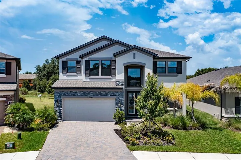 Desirable K-Bar Ranch Sonoma II pool home built by M/I Homes in 2021 with almost 3,600 sq ft of living space has 5 bedrooms, 3 bathrooms, and a 3-car tandem garage. As you enter through the two-story foyer, you have a flex space which can be used as a dining room, office, or Den. The Kitchen is open to the family room, and has a farmhouse sink with upgraded faucet, and quartz countertops with an oversized quartz island, perfect for informal dining. 42" cabinets with under cabinet lighting ideal for late night snacking. Stainless steel appliances, gas stove, and a convenient pot-filler over the stove round out this beautiful kitchen. Exit the home through the double sliding glass doors from either the Kitchen or the family room to enter your outdoor oasis. Spend the hot summer days lounging next to your own private pool with sun shelf, two in pool seating areas and safety fence for the little ones. A private guest bedroom, and bathroom can be found on the first floor, with the additional bedrooms, and bathroom on the second floor. The owners retreat with ensuite can be found upstairs through double doors. You can truly relax on your private balcony overlooking the conservation area with views of the pond nearby. This home comes with 3 exterior privacy cameras. One over the garage, and two rear corners of the house. K-Bar Ranch II amenities: Conference center, resort style pool, basketball court, covered playground, and tennis court. In the heart of New Tampa, you are close to shopping at Wiregrass Mall, Tampa Outlet mall, several local restaurants, and shopping centers. Flatwoods Park with biking & walking trails. Only 30-45 drive to downtown Tampa, and Tampa International Airport via I-75 and I-4.