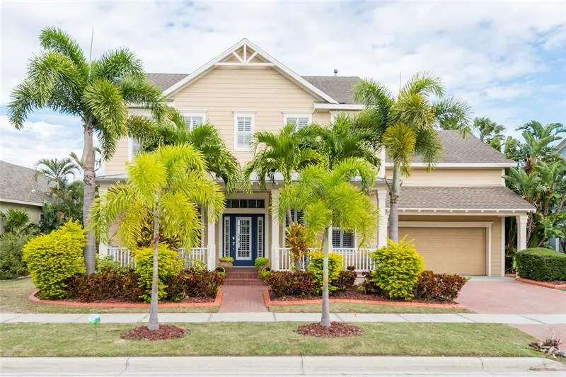 You'll feel your cares drift away the moment you come home to the wide open, unobstructed, soothing water views of this home. No neighbors will be peering across the canal into your yard, because it sits on the pristine 135-acre lagoon. From your private boat lift and dock, you can fish, kayak, paddle board or motor boat with easy access to the waters of Tampa Bay. This nearly 4,000 sq. ft. coastal home is in the exclusive, gated, resort-style community of MiraBay. As you enter the front door, you're greeted with a spacious foyer with views straight through to the water, and formal living and dining rooms. Continue back, and the space seamlessly flows into a bright, open family room with soaring ceilings, lots of windows that bathe the space in natural light, and delivers relaxing views of the open water. French doors bring the Florida lifestyle in, opening to the spacious screened lanai...
