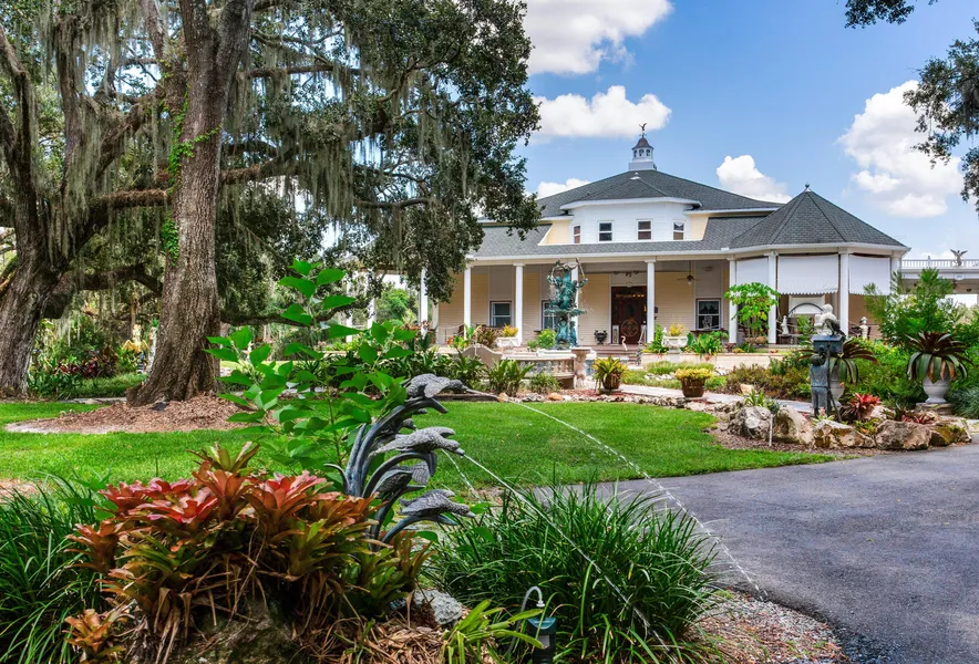 As you enter through the custom iron gates, youll notice the unique details and serene atmosphere at every turn of the winding drive. The over 10,000 square feet of living space in the manor home is the crowning jewel of the estate with its luxury and grandeur truly a one-of-a-kind masterpiece! As you make your way up the winding, private drive, youll notice charming details at every turn the stately live oaks, the lush landscaping, the unique statues, and the motion-activated fountains that make your entrance all the more fun! Pull onto the expansive brick paver driveway and past the impressive fountain onto the massive front porch. Over 12 feet in depth and 94 feet long, the porch offers the perfect warm welcome to guests with sitting areas, a TV and hot tub. As soon as you step foot through the front door you will be in awe at the exquisite details that run throughout the house. Mahogany doors and trim, imported custom glass work and lighting, italian ceramic tile, marble statues, Tulikivi soapstone fireplace, and a personal elevator. The first level of the home boasts the theater with star-lit ceiling, home-office, mail room, two guest bathrooms, catering kitchen, trash chute, solarium and master suite. The kitchen and dining areas of the home are warm enough for family dinners and substantial enough to cater enormous parties. The main kitchen features sprawling granite countertops and commercial grade appliances, with a wet bar, large walk-in pantry and stone-walled wine cellar. On the opposite side of the home is the impressive master suite with attached sitting room, bathroom and walk-in closet. Across the living room are large french doors that lead onto the solarium an all-weather room with panoramic views. Then step onto The Outback the custom back deck designed to remind you of a ship deck overlooking the sea of perennial peanuts in the pasture. Upstairs are three additional bedrooms and an over-sized library and office. The perfect place to run your business, host meetings, or encourage warm conversations over book club or study sessions, this room is lined with mahogany bookshelves, breathtaking views over the patio and multiple seating areas. Outside youll wander down a brick path, through the garden to the large pond that surrounds a massive island. Enjoy views from the top of the hill on the island as you make your way across the bridge, feed fish from the gazebo or race paddle boats around the island and under the fountains! This property is overflowing with love and character a truly unique opportunity and more to see than can even be imagined! A rare and real find for the most discerning buyer!