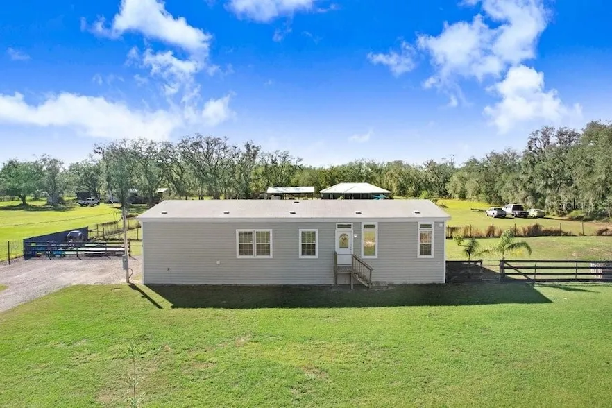Where Hillsborough and Polk Counties meet, this stunning 1-acre homestead offers space, storage, and a beautifully designed 3-bedroom, 2-bath home ready for its new owner. Situated on a corner lot with no easements or encroachments, this property provides both privacy and freedom. A gated drive welcomes you to a 2020 Jacobsen Homes manufactured home, built in nearby Plant City, showcasing exceptional craftsmanship and style. Step inside to discover a bright and airy great room with elegant tray ceilings and oversized windows. Above each window, transom windows add extra height and character to the space. The open floor plan seamlessly connects the living area to the kitchen and dining room, making it perfect for entertaining. The chef s kitchen is nothing short of spectacular worthy of a million-dollar home. A large center island offers ample storage, while a beautiful apron-front farm sink overlooks the backyard. White cabinetry provides an abundance of storage, and a hidden walk-in pantry cleverly tucked behind the cabinetry adds a touch of luxury and convenience. The primary suite is spacious and thoughtfully designed, featuring an oversized walk-in closet and an en-suite bathroom with natural light, extensive storage, and a shower large enough to feel like its own room. Two additional bedrooms and a guest bath complete the living spaces, while an indoor laundry room offers backyard access for added convenience. Crown molding runs throughout the home, enhancing its elegance and timeless appeal. Step outside to enjoy a wood deck leading to a backyard play area. Follow the asphalt gravel path across the property, and you'll find a well-equipped barn area with animal pens, parking spaces, and two modified shipping containers. One container is fully finished as an office space, complete with water, power, AC, and a small tankless water heater. The second serves as a workshop and storage shed, with a 400 sq/ft concrete pad in between, complete with a roof. A dedicated 100-amp breaker box powers the entire barn area, and water access is readily available. There's still plenty of room to grow on this property whether it's revitalizing the pond area, creating a small pasture, or cultivating fresh produce in the garden boxes. Best of all? No HOA. That means the freedom to truly make this property your own. Come experience what it means to "Live Free in Florida!"