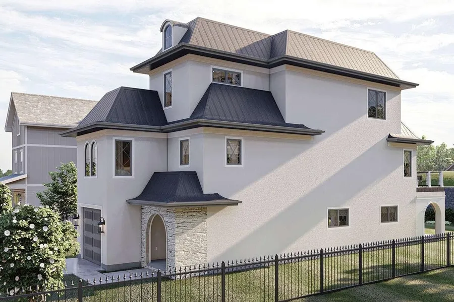 Pre-Construction. To be built. Welcome to this exceptional 4-bedroom, 2 full / 2 half-bath, 3-story residence offering 2,774 sq. ft. of heated living space with timeless architectural detail and modern luxury. From the moment you arrive, the home’s arched entry, stone accents, and dramatic rooflines set the tone for its distinctive style. Inside, you’ll find elegant design and thoughtful craftsmanship throughout. The main level opens to a spacious family room with fireplace and custom built-ins, flowing seamlessly to a covered porch ideal for entertaining or relaxing. A private elevator provides convenient access to all three floors. The heart of the home is the chef’s kitchen, featuring an oversized island, sleek cabinetry, high-end fixtures, and a walk-in pantry. Open to the great room and dining area, this space is perfect for gatherings, with doors extending to a large deck for indoor/outdoor living. The primary suite is a true retreat with a spa-inspired bath including dual vanities, a soaking tub, and a walk-in shower. Upstairs, three additional bedrooms and a full bath provide ample space for family, guests, or home office needs.