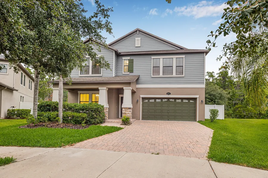 Located in a quiet cul-de-sac within the gated community of Heron Preserve at K-Bar Ranch, this spacious 5-bedroom, 3.5-bath home offers over 3,800 square feet of living space and a functional layout suited for everyday living. The primary bedroom is conveniently located on the first floor and offers privacy from the rest of the home. Upstairs, you'll find a large bonus room, four additional bedrooms—each with walk-in closets—and two full bathrooms with dual sinks, making it a great fit for a larger household. A half bath is located on the main floor, and the laundry room is upstairs for added convenience. The kitchen is the central hub of the home and opens to the family room. It includes stainless steel appliances, wood cabinets with crown molding, granite countertops, and a large walk-in pantry. The formal dining room is connected to the kitchen through a pass-through butler’s area. Additional features include a screened-in patio, a fully fenced yard backing up to a conservation area, and a tandem three-car garage. Situated on a quiet lot in a gated New Tampa neighborhood, this home offers plenty of space and flexibility in a peaceful setting. New Tampa is close to top-rated schools, restaurants, golf courses, I-75, Moffitt Cancer Center, Advent Health, The Shops at Wiregrass, Tampa Premium Outlets, USF and more.