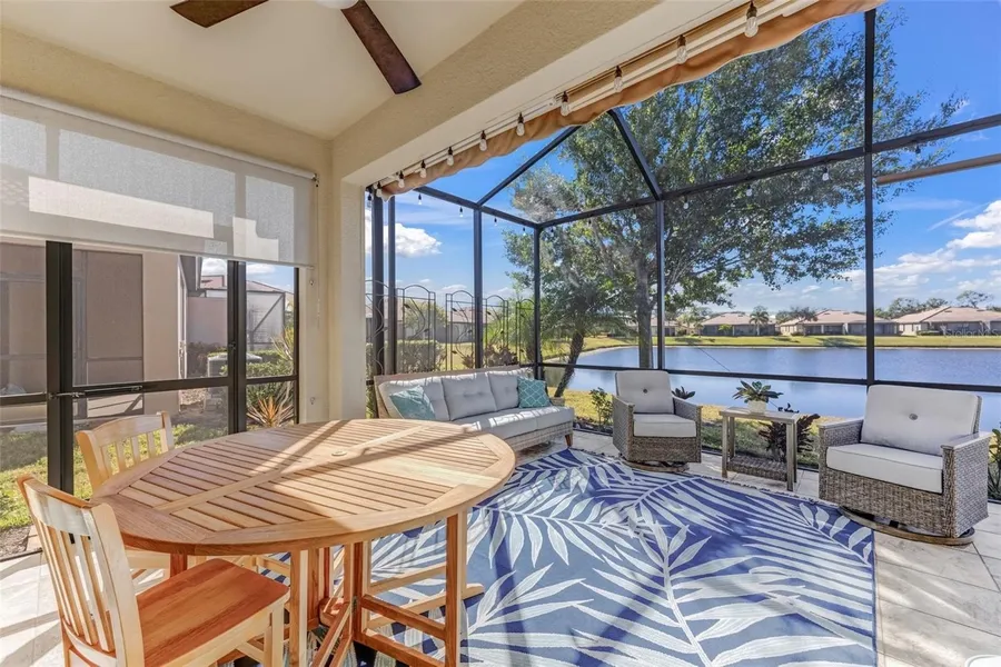Under contract-accepting backup offers. YOUR SEARCH IS OVER!!! Don’t wait to view this MOVE-IN READY…. ABSOLUTELY STUNNING VILLA. Located in the beautiful highly desirable gated 55+ Southshore Falls Del Webb Community. 2 bedrooms 2 Bath and 2 car garage villa. From the moment you arrive at this immaculately maintained home you will sense the pride of ownership. This beautiful water view home is perfectly situated on a large lot (landscaping maintained by HOA). As you enter into the gorgeous home you will be impressed with the open spacious floor plan, crown molding with tasteful overhead lighting/ceiling fans. Large bright chef's dream gourmet kitchen with beautiful tiled backsplash, quartz countertop, with plenty of workspace, gorgeous cabinets with pull out drawers, recessed lighting, and breakfast bar. Spacious dining & living room providing the perfect open floor space for relaxing and entertaining. The large master suite includes, a large walk-in closet with a completed closet system, adjoining bathroom with double vanities counters and a large walk-in frameless shower. As you step outside into your HUGE private tiled lanai enjoy the peace and quiet. No backyard neighbors. Perhaps enjoy a cup of coffee or an adult beverage with a good book or watch the ever-changing views of nature of your gorgeous Waterview. On those bright sunny days, dual electric retractable awnings provide shade. Many upgrades and extras including water softener (2025), water heater (2025), complete HVAC (2023), plantation shutters, quartz countertops, beautifully finished cabinetry crown molding, murphy bed in guest bedroom (2020), epoxy garage flooring, attic access stairs, Hurricane Shutters, Gutters, and SO MUCH MORE!! Enjoy an active adult lifestyle with resort style amenities: 14,000 sq. ft. clubhouse offers billiards, coffee/internet cafe, state of the art fitness center, library/card room, hobby/craft room and grand ballroom for parties and events! A sparkling lagoon pool and spa, resistance pool. Bocce ball, pickle ball courts, tennis courts and a putting green trail. Private roads with nature and walking trails, sidewalks and biking. Plus, the community offers numerous activities and social/special interest clubs. This gated 24-hour manned guarded community has everything you could ever need so there’s always something to do! Truly a wonderful place to entertain family and friends! Located near shopping, waterfront dining, and a short drive to the beautiful Florida beaches! No CDD. Call for an appointment to view this stunning home. EASY TO VIEW. You will not be disappointed. Welcome to your own piece of Paradise! Some furnishings available under separate purchase.