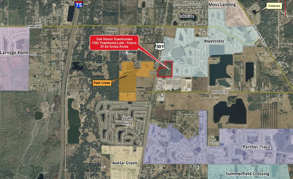 Oak Haven is a 22 acre parcel zoned for a maximum of 130 townhome units currently at the entrance to Rivercrest. The site has approximately 14.3 usable acres as a wetland buffers the majority of the property from US 301.