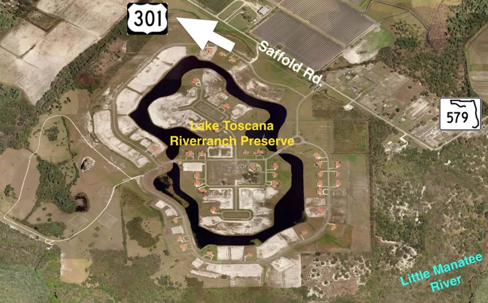 LOCATION DESCRIPTION Lake Toscana is located at 4225 Saffold Road, in Southern Hillsborough County, FL. To get to the community, take I-75 to exit 240 (674 East). Turn right at US-301 South, then left onto Saffold Road. The project will be located on the south side of the road.