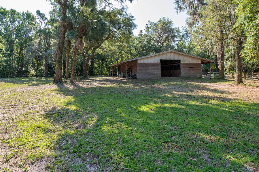 Serene and Secluded Private Homesite with many improvements. This private retreat features a winding road that leads you through beautiful, natural Florida habitat and undisturbed creek to the secluded homesite and barn at the rear of the property. The house is 672 square feet with 1 bedroom and 1 bathroom. The barn offers 9 stalls, a tack room with AC and restroom, 6 overhang on the exterior of each stall and 4 paddocks. In addition to the barn there is a carport with an air-conditioned office and an equipment shed. Being bordered by conservation land to the north, this property boasts a completely secluded homesite, with a natural buffer left intact along the perimeter. Many improvements to the property to save you extra time and money, like power and water accessible at the gate and entirely fenced in field fencing.