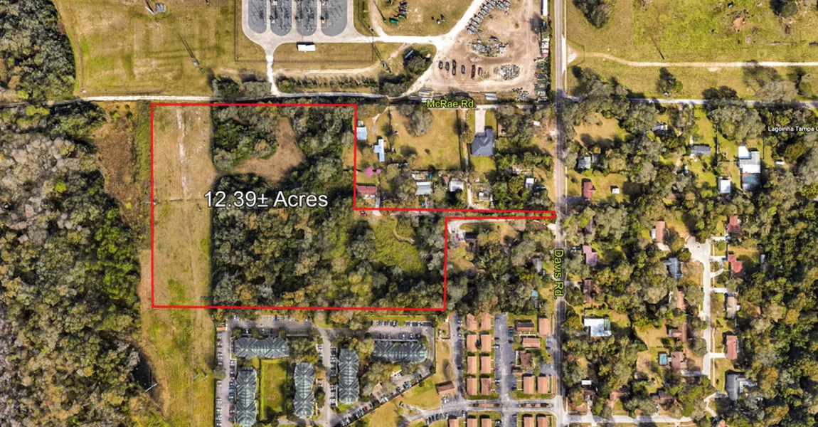 PROPERTY DESCRIPTION - This opportunity is 12.39 gross acres (9.36 net usable acres) zoned ASC-1, 1 home limit, for residential located on the west side of Davis Road at KricketLane with the main site located on the south side of Kricket Lane in Hillsborough County, FL. The immediate area is a mixture of single and multi-family housing, as well as mobile-homes. Kricket Lane (private) has a shared access easement for ingress/egress by the property owners alongthe north side of the road. An additional point of ingress/egress could be along McRae Road that is a privately maintained public road.Additionally, the western 200 feet is encumbered by a TECO power line easement with high voltage lines coming from the power substation to the north, which is limits the amount of developable land to only 9.36 net usable acres.
