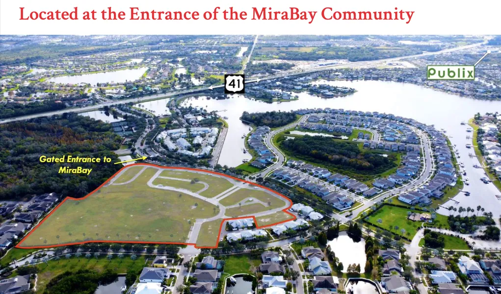 PROPERTY & LOCATION DESCRIPTION - 84 townhome lots located within the gated MiraBay community in Apollo Beach, Florida. The site offers access to the amenities of MiraBay as well as proximity to major employment centers such as Downtown Tampa (30 minutes), Downtown St. Petersburg (30 minutes), Westshore Business District (35 minutes), and Downtown Bradenton (35 minutes). The location also provides proximity to major retailers such as Winn Dixie (half mile), Publix (two locations, 1.4 miles and 2.5 miles), and Walmart (coming soon, 1 mile). Tampa International Airport and St. Pete-Clearwater International Airport are both within a 40 minute drive.