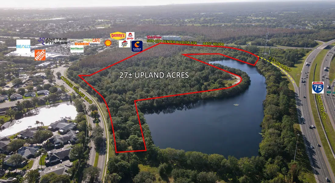 PROPERTY DESCRIPTION - This is the opportunity to develop a commercial parcel which is 45.5 acres of which 18.3 acres are wetlands, with a .5 FAR and 6 acres with a .35 FAR zoned for offices, banks, and similar commercial uses. There is not a height restriction for the R-1 and R-2 designated properties in the Villages of Cypress Creek. It abuts an 18-acres lake and an 18 acres nature preserve. It has frontage on Cypress Creek Blvd, 4 lanes with a landscaped median. The western boundary has full exposure from I-75.