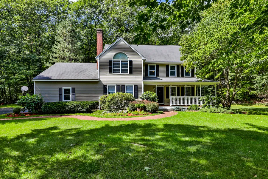 This wonderful Bedford colonial sits back on a private 5 acre lot. Beautiful mature landscaping with whole lawn irrigation. A farmers porch and 3 car attached garage are just a few of the great features this home has to offer. The 2 story foyer has pocket doors leading to a 1st floor office/den. Living room with a wood burning fireplace. Eat in kitchen with abundant cabinets has slider leading to large deck. Master bedroom has cathedral ceilings with pocket doors to the luxury master bath. Come check out this gem.