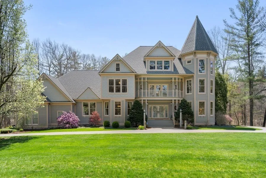 This custom-designed modern Victorian is located in an exclusive neighborhood, just 1 hour from Boston. Upon entering you are welcomed into a grand 3-story foyer with curving staircase and custom woodwork. The kitchen is both elegant and functional with a 18.5' granite island with integrated seating for 5, Subzero fridge, Thermador range and 3 wall ovens (steam convect, microwave, conventional), a walk-in pantry and full butler's pantry. A wet bar with beverage fridge, sink and icemaker adjoins the 2-story family room with wood-buring fireplace. A covered porch surrounds the home and leads you to the newly-installed patio with built-in lighting, firepit and water feature. The property is professionally landscaped with a pond, perfect for winter ice skating! The 1st floor also includes two 1/2 baths, a formal living room, dining room, office and a large storage/laundry room, with wood or tile floors throughout.