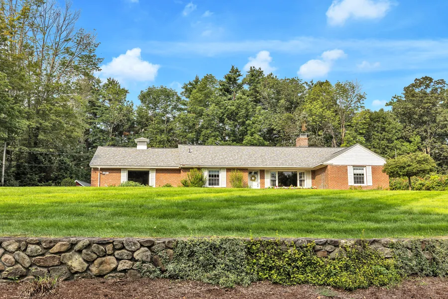 Set high above its neighborhood street, with a broad expanse of level front and back yards, this quality brick ranch offers on the level living within walking distance to downtown Peterborough. Well maintained, its bright and airy interior is move-in ready. Hallmarks of its construction include hardwood floors, crown molding, central AC, Buderus furnace, central vacuum and whole house automatic generator. Recent roof and town water and sewer. Front entry to fireplaced front to back living/dining room. Expansive granite countertopped kitchen with Wolf gas range, dishwasher, and refrigerator. Adjacent Laundry closet. Pass through to the family room with skylit, vaulted ceiling and sliders to the Trex deck with awning. Pocket doors separate off the office. Primary bedroom has a dressing room and private shower bath with his and hers vanities. Guest bedroom and shower bath complete the main floor. On the lower level is partially finished space with half bath, now used for storage, and unfinished utility area. Attached two car garage has utility sink for gardening and projects. Detached 16' x 24' outbuilding. Occupancy 11/13/2023.