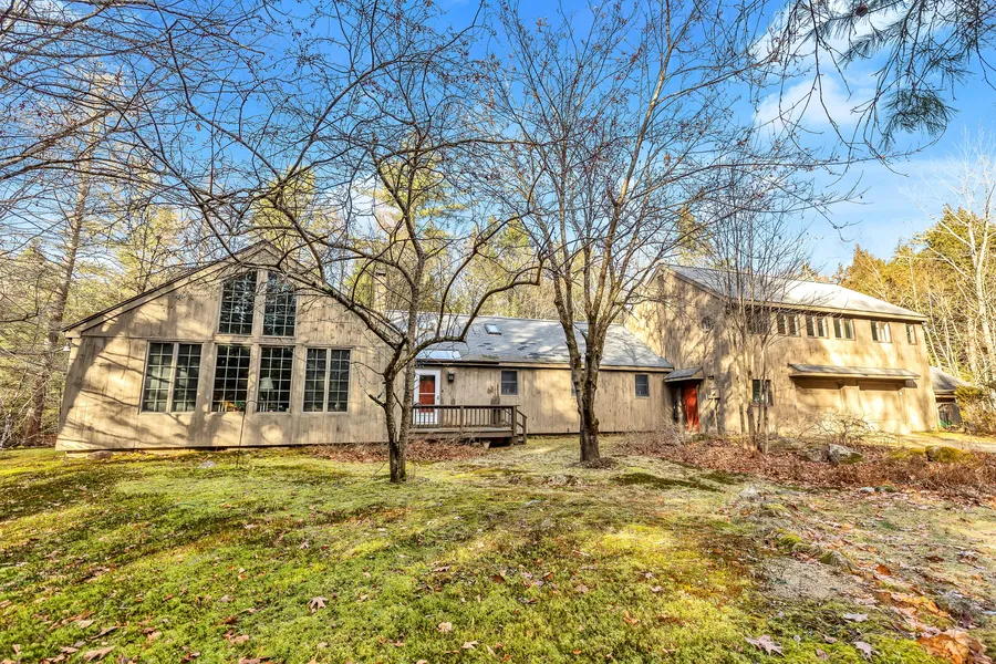 A long, privacy ensuring driveway leads to the brookside site of this rustic contemporary, designed to blend with its sylvan surroundings. The privacy is further enhanced by abutting acreage owned by the Harris Center for Conservation Education, part of a 25,000 acre Super Sanctuary, which will always remain protected land. The main house features a Great Room with vaulted ceiling, woodstove, living and dining areas open to the kitchen off of a South facing deck . Adjacent is the pantry/laundry and utility area. There is a first floor bedroom, shower bath and office/study used as a primary suite. The living areas have views of the babbling brook. Also on the first floor are the formal dining room, living room/music room with library alcove, TV den and entrance off the mudroom that connects to one of the two car attached garages. On the second floor, the main house has 3 bedrooms, hall ba...