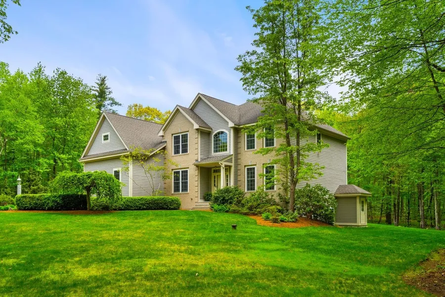 Nestled in one of Hollis's most coveted neighborhoods, this home offers a rare opportunity on a park-like setting. Situated on 3 acres and bordered by conservation land, it provides a serene escape and trail access directly from the backyard for year round enjoyment. The welcoming 18-ft foyer leads to 3 levels of living space. The open concept design floods the interior with natural light, highlighting a striking two-story gas fireplace in the living area and vaulted three-season room. The chef's kitchen boasts high-end appliances, a spacious island with a second sink, wine fridge, and walk-in pantry. Outside, enjoy your own oasis from your deck or stone patio with built in fire pit surrounded by bursts of color from flowering trees, shrubs and perennials throughout the yard. Other features include office, double French doors, crown molding, shadow boxing, and built-ins. Upstairs the primary suite includes a sitting area, walk-in closet, and ensuite bathroom with tub and walk-in shower. Three additional bedrooms offer walk-in closets and ensuite or Jack and Jill bathrooms. The lower level provides potential for a future in-law suite, a media room, spacious open area for gaming and living, and ample storage. Well-lit with natural light, this level offers flex space including a room for a second office. Completing this exceptional property is a 3-car garage. Enjoy luxurious living surrounded by nature and modern comforts.