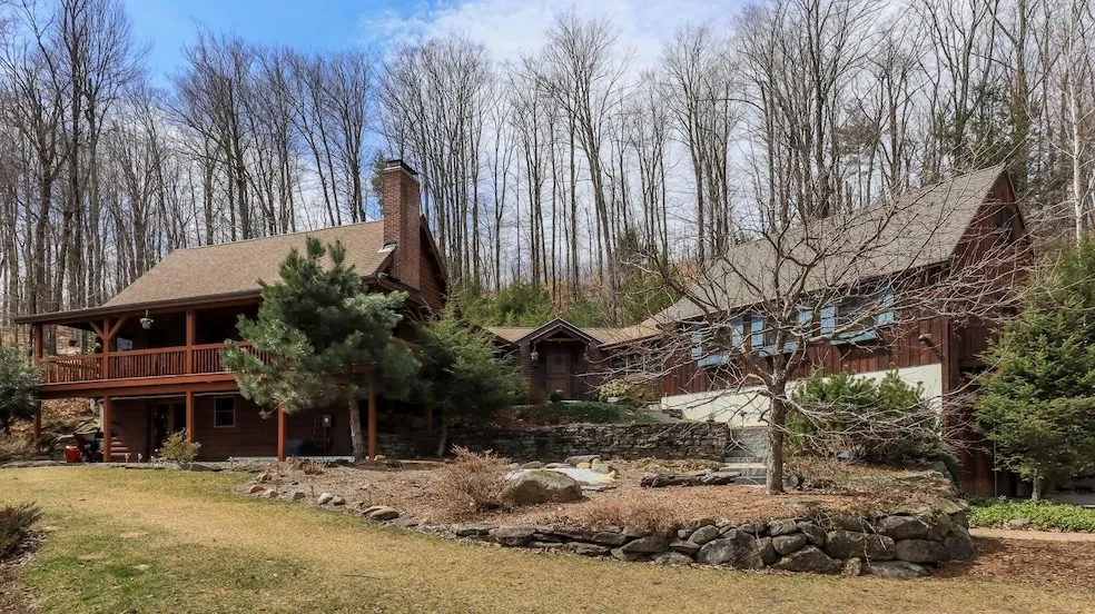 RIDGETOP LOG HOME RETREAT WITH UNCANOONIC MOUNTAIN VIEWS! Escape to the tranquility of this secluded, custom-designed log home nestled on 31.36 private acres of towering Evergreens, Maple & Birch forest. Enjoy walking trails leading to 2 serene ponds, a sanctuary for nature lovers, home to ducks, geese & turtles. A striking granite hardscape entry welcomes you inside the curved foyer to a stunning POST & BEAM main interior with soaring cathedral ceilings, raised hearth fieldstone fireplace with a woodstove insert. The Chef's center-island kitchen boasts Hickory cabinets, center island with granite countertops, new SS appliances, lighting fixtures, blending rustic charm with modern convenience. The 1st floor primary suite features a spa-like tiled bath, walk-in closet. Upstairs, a 2nd level loft bedroom, tile half bath. A stunning guest wing addition, crafted with hand-cut log posts & han...