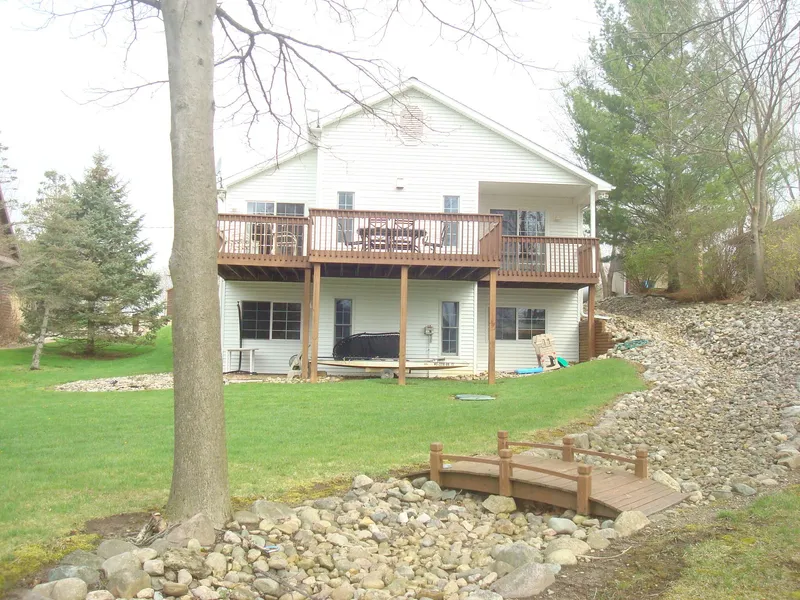 Lake Diane 2002 3BR/3BA Rach with 2 car attached garage on partially finished walk out basement has 72 feet of channel frontage with a super sandy swimming beach on 400 acre spring fed all sports Lake Diane. Vaulted ceilings enhance the open floor concept. Custom kitchen includes appliances and has dining area that leads to the deck overlooking the beautiful channel. Gas log Fireplace in living room. Primary bedroom has on suite bath, walk in closet sliders to deck. Laundry including washer/ dryer connects to the finished garage. Basement has drywall in place, most electric and full finished bath ready for you to create your desired living space. Nice mature trees give shade to the yard, dock and sandy beach area . There is ample parking for guests. Make this your new Happy Lake Home.